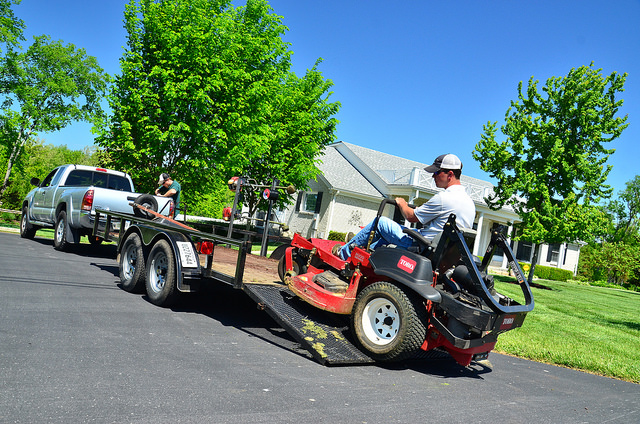 3. When he’s finished, he loads the mower back on the trailer and drives to the next job site.